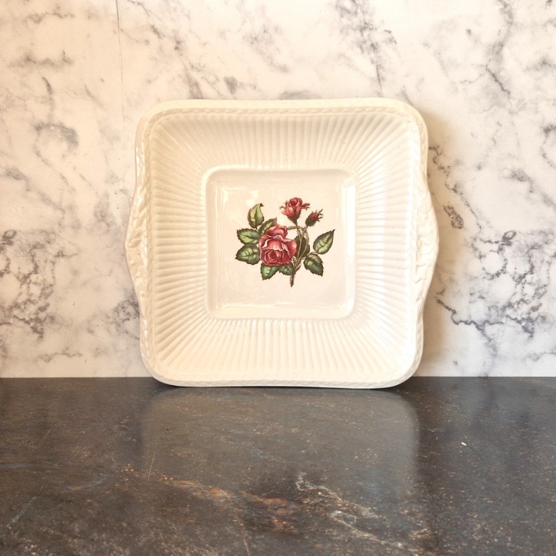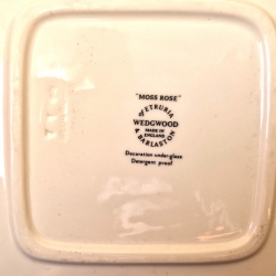 Wedgwood cake of koekschaal uit de collectie Moss Rose. De schaal is onbeschadigd en in nieuwstaat. De afmetingen zijn 23 x 25.5 x 3 cm.
