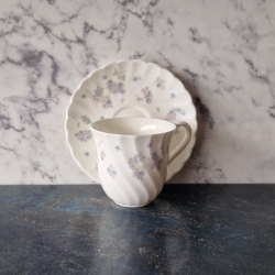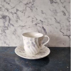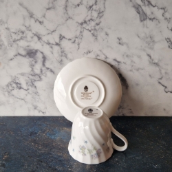 Super mooie koffiekop en schotels van Wedgwood uit de serie April Flowers. De kop en schotels zijn in nieuwstaat, nauwelijks gebruikt en onbeschadigd. De afmetingen zijn: diameter 7.3 cm, hoog 6.7 cm. Het schoteltje heeft een diameter van 12.5 cm.