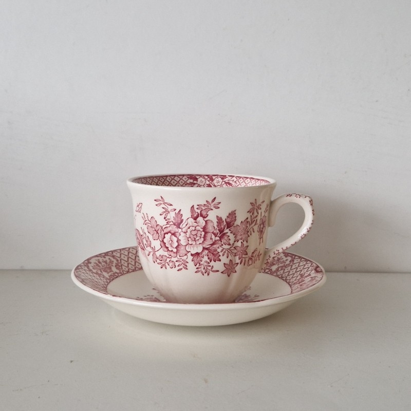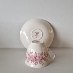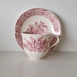 Mason theekop en schotels uit de serie Stratford. De kop en schotels zijn in nieuwstaat, waarschijnlijk ongebruikt. Diameter van het kopje is 8.7 cm en de hoogte is 7.3 cm. Het schoteltje heeft een diameter van 14.8 cm.