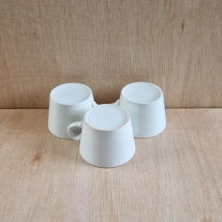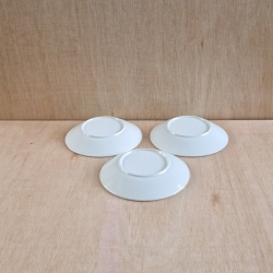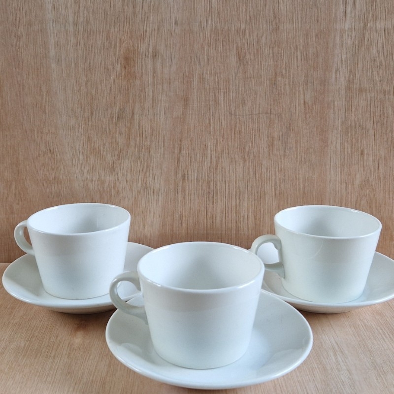 Kop en schotels van Arabia Kilta, kleur: wit. Afmeting: Ø 80 mm H 57 mm, schoteltje Ø 125 mm. Puntgaaf maar met gebruikssporen zoals krasjes en lichte verkleuring! Designer : Kaj Franck. Merk niet meer aanwezig.