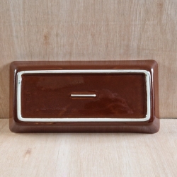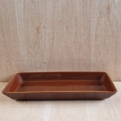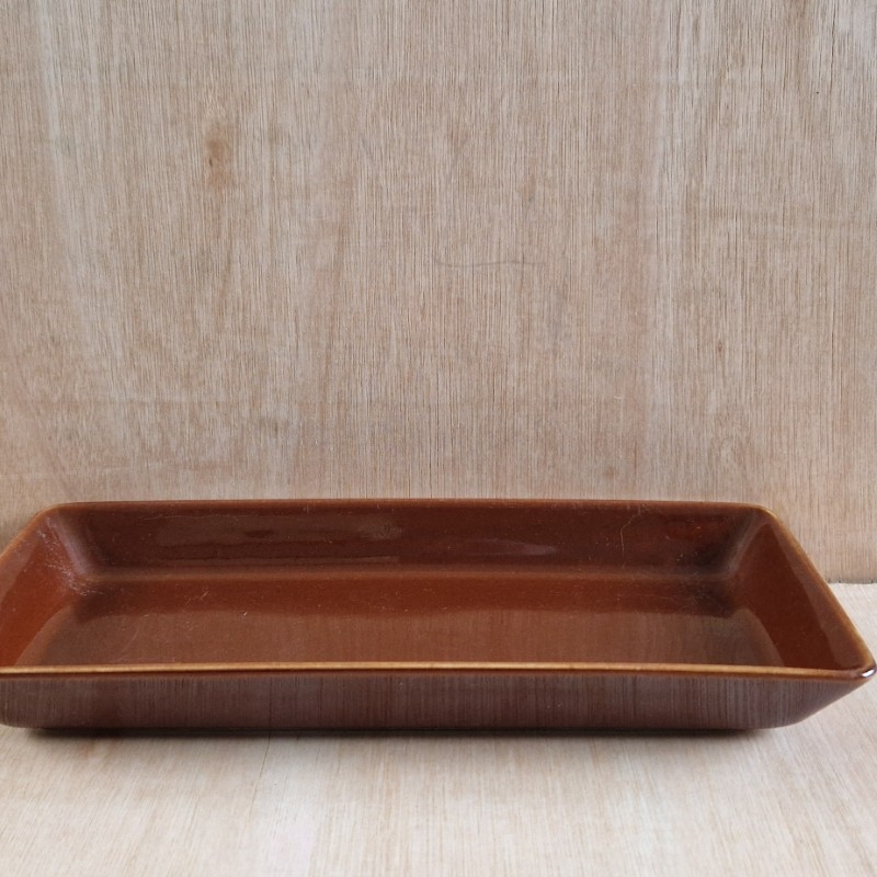 Arabia Finland Kilta Cakeschaal. Kleur : Bruin. Puntgaaf. Lengte : 30,7 cm, Hoog : 3,7 cm, Breed : 15 cm. Designer : Kaj Franck . Productie periode : 1953 – 1974. Puntgaaf heeft echter wel gebruikssporen.