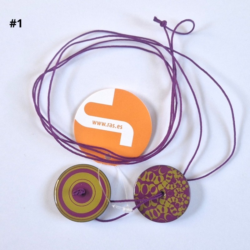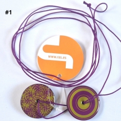 Halssnoer Esmaltado. De hanger aan het koord van halssnoer Esmaltado is aan beide kanten voorzien van een kleurig dessin. Het dessin en tinten zijn in het oog springend en geven een beetje het jaren 60 gevoel. Het koord is gemaakt van katoen. Afmeting hanger : Ø 35 mm