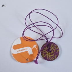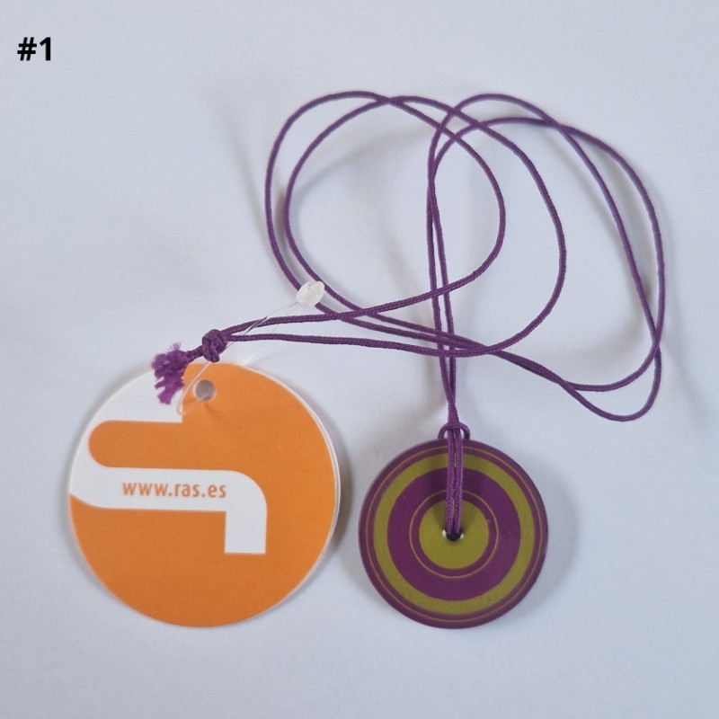 Halssnoer Esmaltado. De hanger aan het koord van halssnoer Esmaltado is aan beide kanten voorzien van een kleurig dessin. Het dessin en tinten zijn in het oog springend en geven een beetje het jaren 60 gevoel. Het koord is gemaakt van katoen. Afmeting hanger : Ø 35 mm.