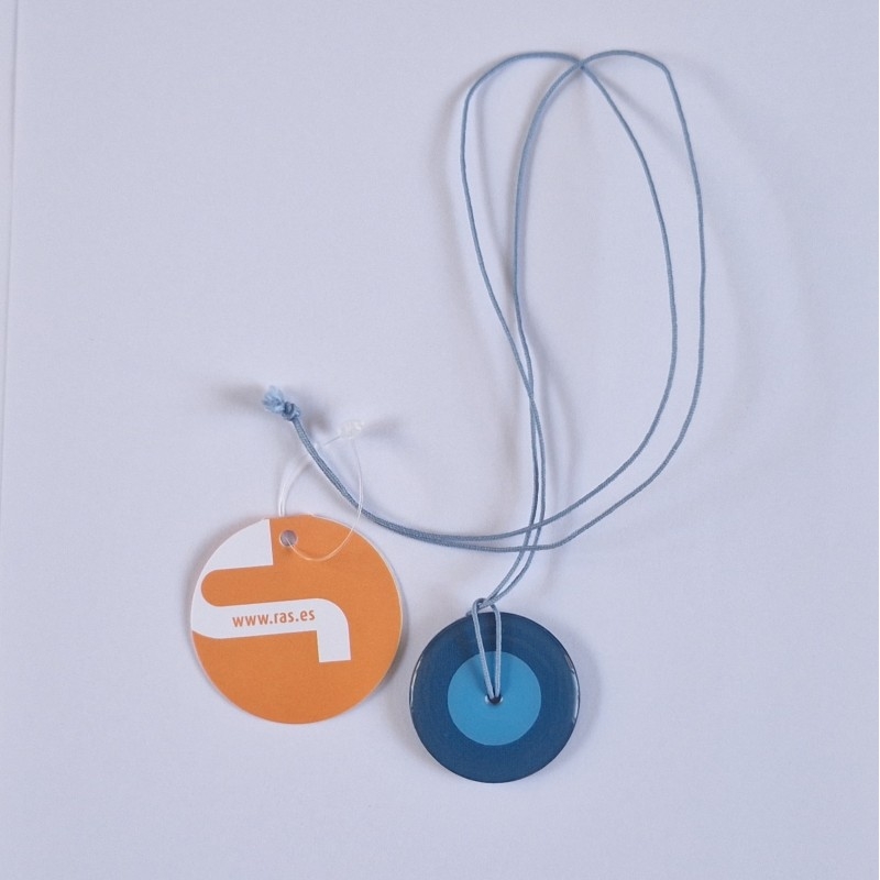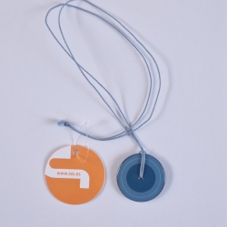 Halssnoer Esmaltado. De hanger aan het koord van halssnoer Esmaltado is aan beide kanten voorzien van een kleurig dessin. Het dessin en tinten zijn in het oog springend en geven een beetje het jaren 60 gevoel. Het koord is gemaakt van katoen. Afmeting hanger : Ø 40 mm.
