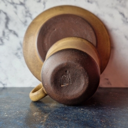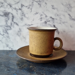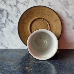 Kop en schotel Zaalberg. Kop en schotel is puntgaaf. Afmeting hoog 7,5 cm, Ø 7,5 cm.