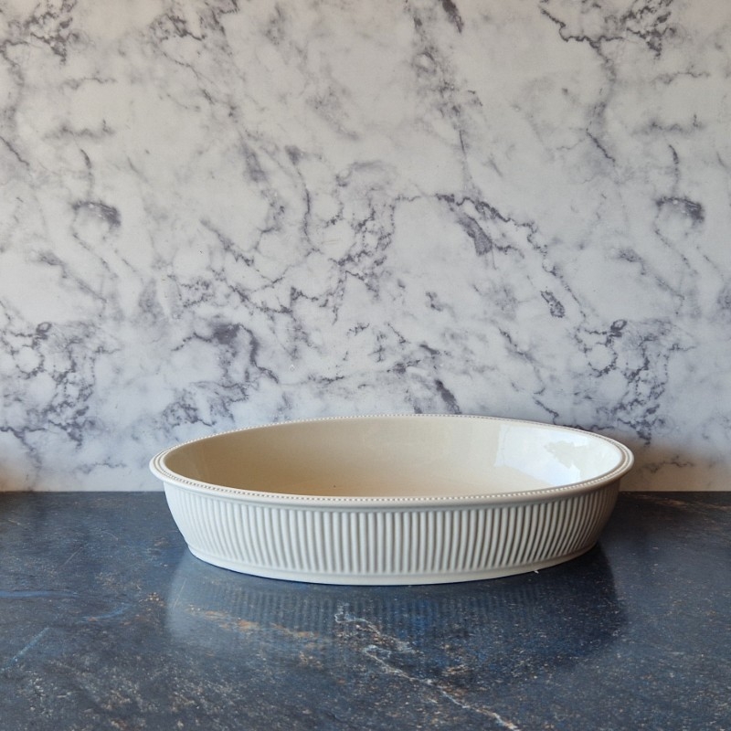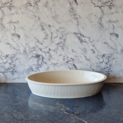 Wedgwood Windsor ovale ovenschaal. De schaal is in zeer mooie staat maar het wedgwood merk is in de vaatwasser eraf gewassen. 2 kleine fabricage foutjes aan de rand.